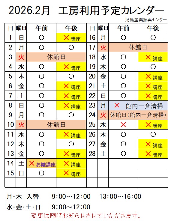 *会議室の料金お支払いは28日正午までとさせていただきます。 *レンタサイクル貸出受付は27日までとさせていただきます。 *一般工房は 7日からになります。