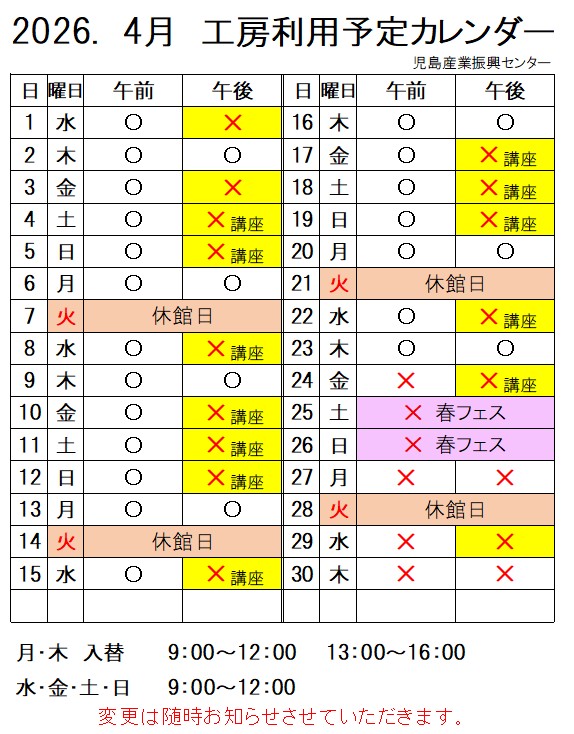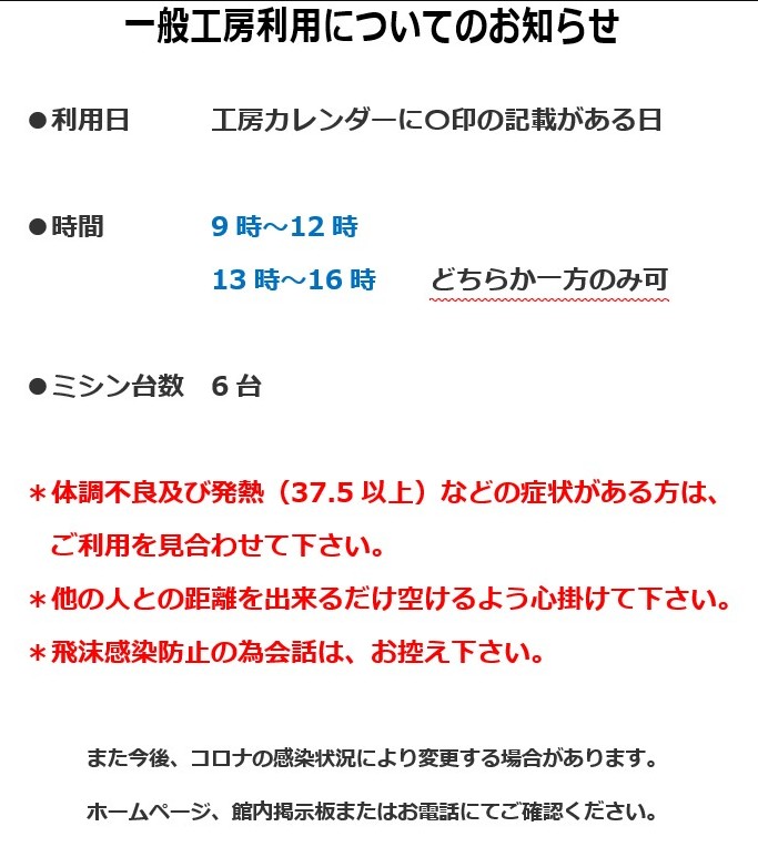 R8.4月 工房一般開放についてのお知らせ